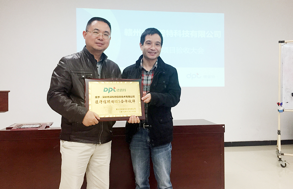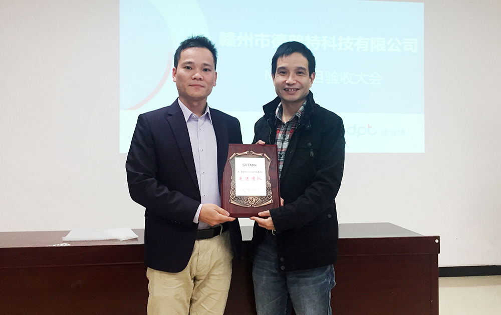 ? ? ? ? 結(jié)案會(huì)上,贛州德普特對(duì)于深科特的專(zhuān)業(yè)及實(shí)施能力表示欣賞,授予深科特實(shí)施團(tuán)隊(duì)“先進(jìn)團(tuán)隊(duì)”稱(chēng)號(hào),是對(duì)我們產(chǎn)品及服務(wù)的巨大肯定。